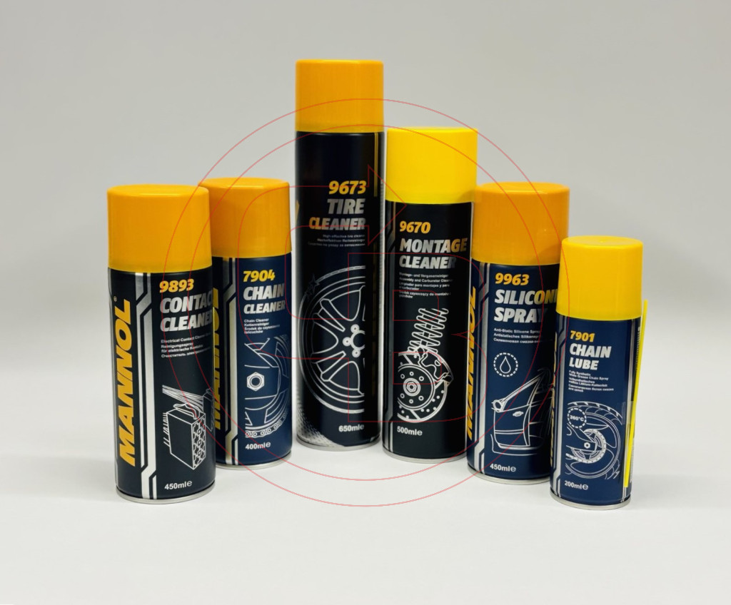 – 6 részes készlet: féktisztító + karburátortisztító (500 ml), gumiápoló spray (650 ml), kontaktspray (450 ml), lánckenő spray (200 ml), lánctisztító spray (400 ml), szilikon spray (450 ml)