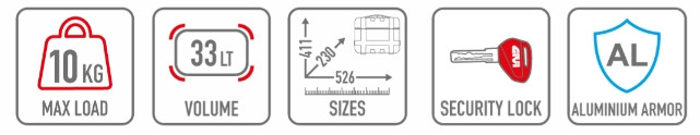 Méretei: 411 x 230 x 526 mm. Kapacitása 33 liter, maximális terhelhetősége 10 kg. Ez a méret ideális kisebb felszerelések, kabátok vagy akár egy nyitott sisak tárolására.
