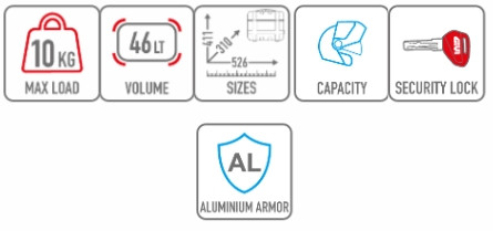 Kapacitása 46 liter, ami elegendő egy felnyitható bukósisak és egy nyitott sisak szállítására. Maximális terhelhetősége 10 kg, így ruhákat, felszerelést vagy akár a napi bevásárlást is kényelmesen elhelyezhetsz benne.