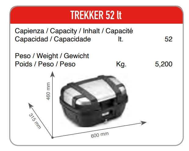 A GIVI TRK52B Trekker top‑case egy kimagaslóan tágas, 52 literes hátsó doboz, amely két felnyitható vagy zárt bukósisak kényelmes elhelyezését is lehetővé teszi. Ideális választás túrázáshoz, városi használatra és hosszabb motoros utakra, amikor fontos, hogy minden felszerelésed szárazon és biztonságban megérkezzen.