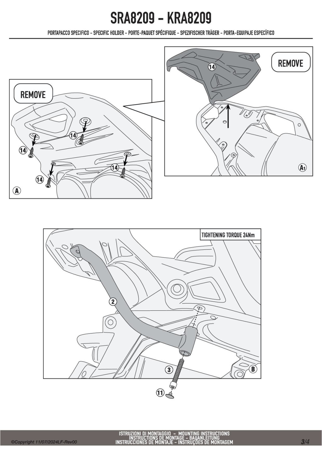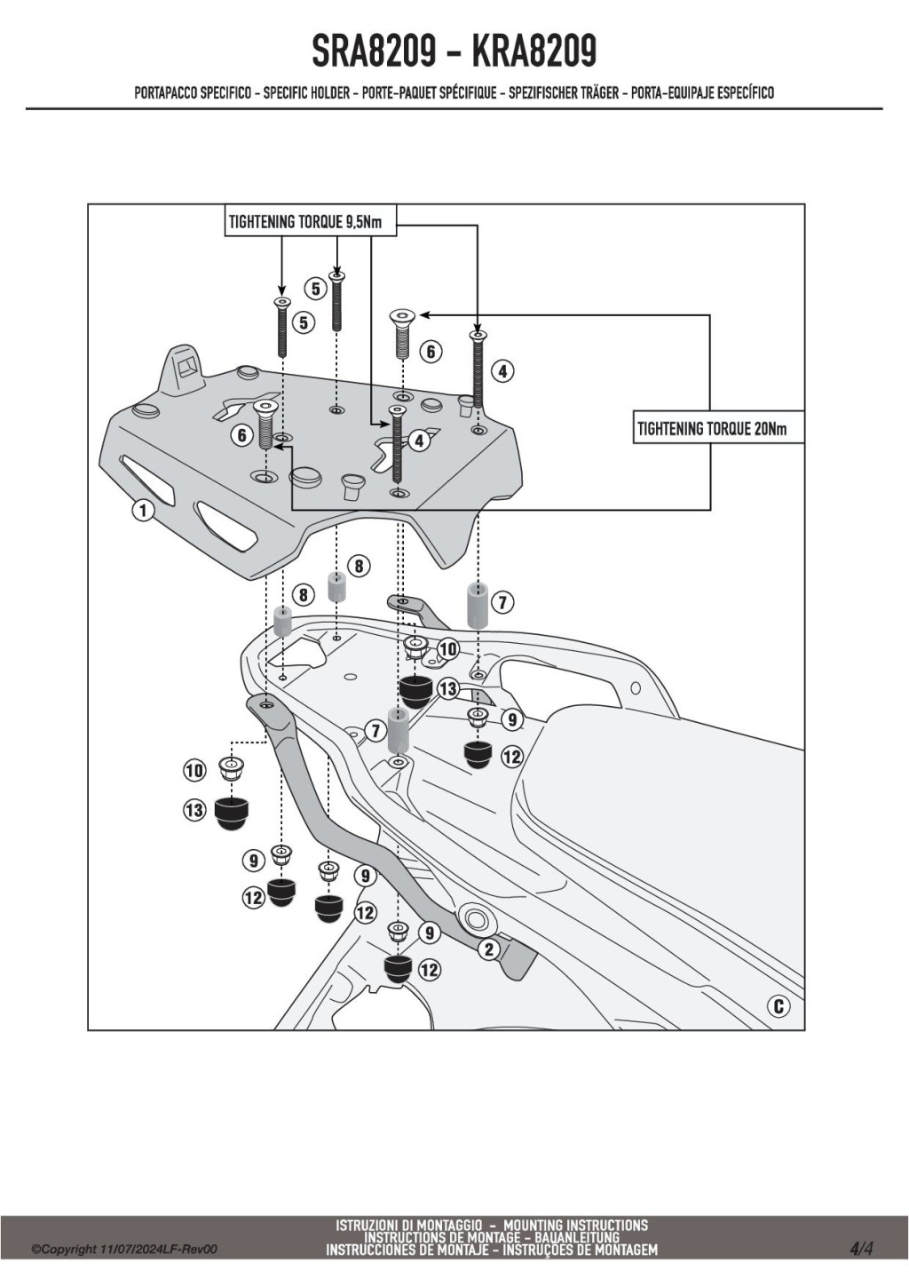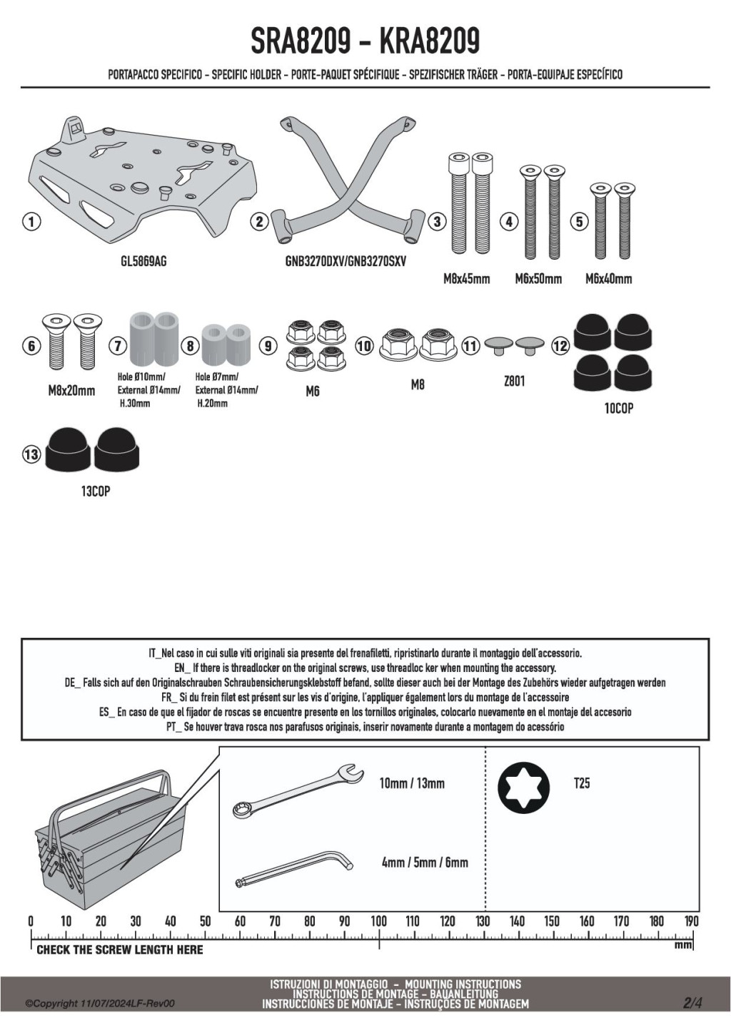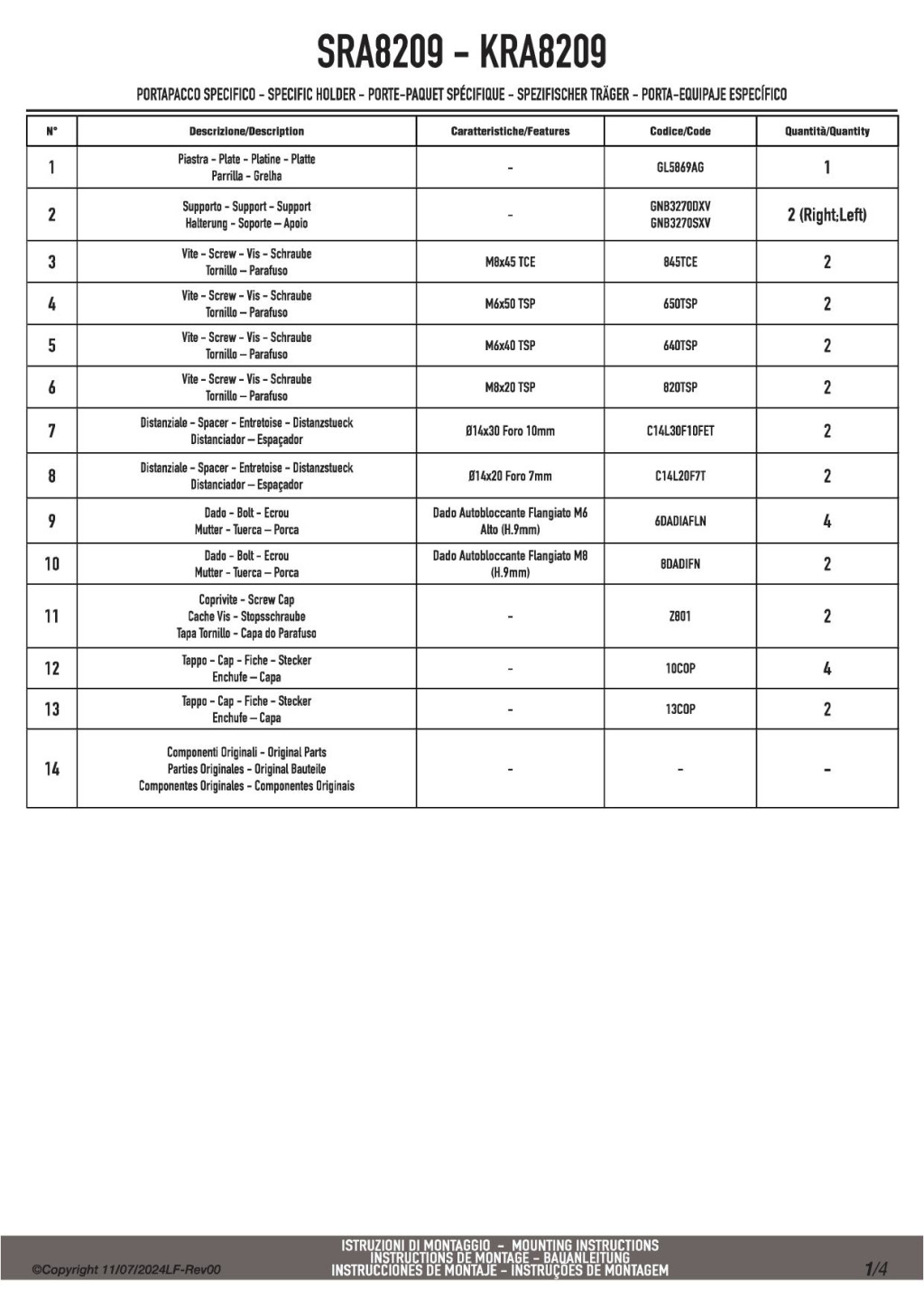A GIVI hangsúlyozza, hogy az SRA8209 csak gyári alkatrészekkel szerelt motorokon használható. Ha utólagos módosítások — például oldaldoboz tartó felszerelése — történtek, ezek akadályozhatják a szerelést. Ilyen esetekben ajánlott szakemberrel egyeztetni.
