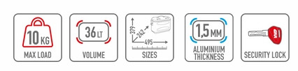 Méretei: 379 x 242 x 495 mm. Egy doboz űrtartalma 36 liter, teherbírása 10 kg. Ez elegendő helyet kínál egy nyitott sisak vagy a hosszabb utakhoz szükséges felszerelések tárolására.