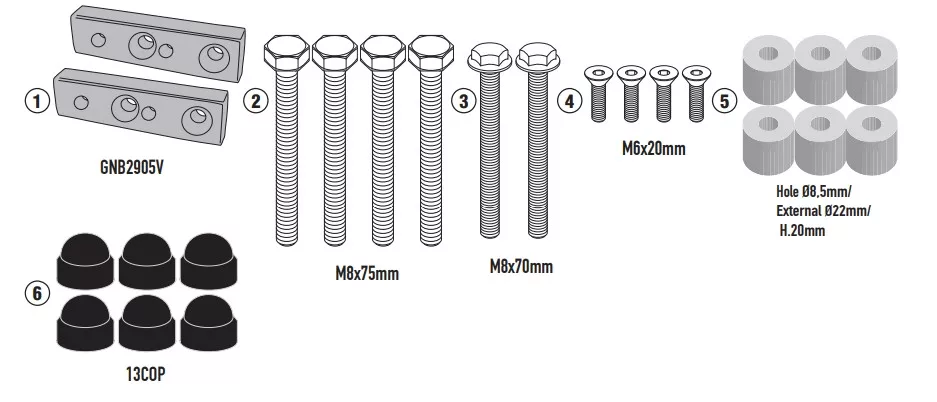 A GIVI felhívja a figyelmet arra, hogy a készletet eredeti (OEM) állapotban lévő motorokhoz tervezték. Ha a motoron már más kiegészítők (például egyéb tartók, konzolok) vannak, ezek akadályozhatják a szerelést.