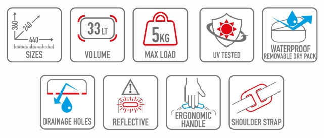 A 25 literes vízálló, kivehető belső zsák mellett egy 8 literes rekesszel, irattartó zsebbel és külső zsebbel is rendelkezik. Strapabíró, UV-álló anyagból készült, felső dupla pánttal kabát vagy esőruha rögzítésére. Ergonomikus fogantyúja és állítható vállpántja kényelmes hordozást biztosít, a fényvisszaverő perem pedig extra biztonságot nyújt.