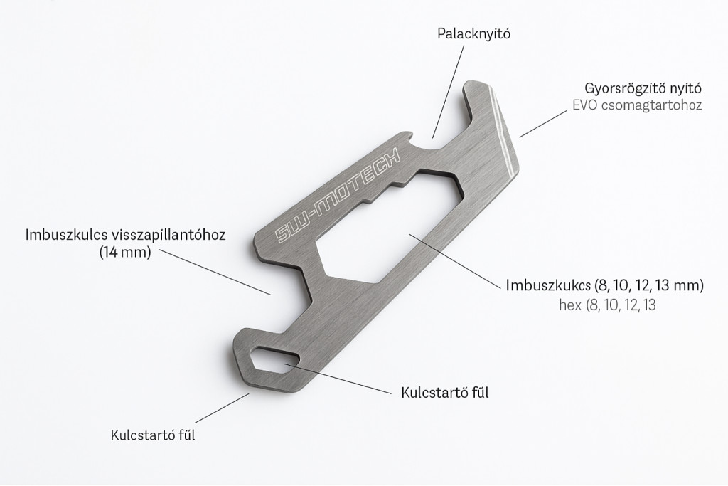 Ez a praktikus eszköz hét funkciót egyesít kompakt méretben. Találsz rajta üvegnyitót, quick-release nyitót az EVO és PRO oldaltartókhoz, valamint öt méretű imbuszkulcsot (8, 10, 12, 13 és 14 mm). A 14 mm-es imbusz különösen jól jön például motoros visszapillantó tükrök vagy karos szerelvények oldásakor.