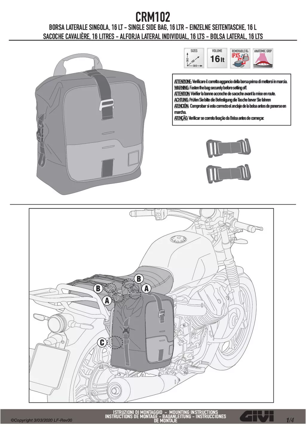 A GIVI CRM102 egy 16 literes, vízálló oldaltáska, amelyet kifejezetten retró, café racer és custom stílusú motorokhoz terveztek. Klasszikus megjelenése tökéletesen illeszkedik a vintage motorok eleganciájához, miközben a modern GIVI technológiának köszönhetően a mindennapi használathoz is praktikus és megbízható társ.