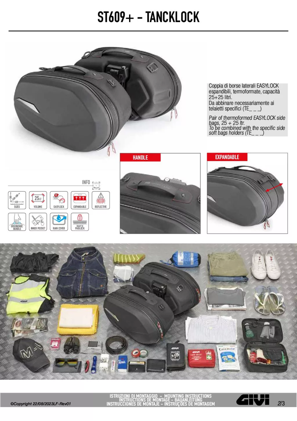 A GIVI ST609+ a gyártó 2020-as sportos, prémium kollekciójának része, amely a design, a komfort és a praktikum tökéletes egyensúlyát kínálja. Ez a maximum 25+25 literes kapacitású, bővíthető oldaltáska szett thermoformált kialakítással és aerodinamikus formavilággal rendelkezik, amely különösen a sportmotorokhoz illik.