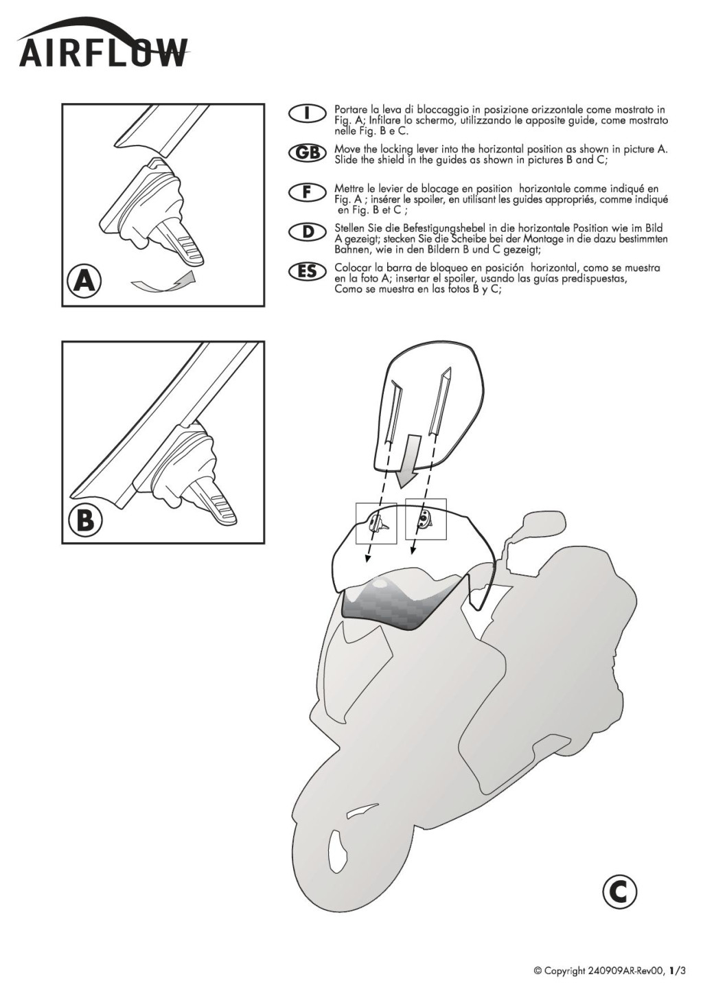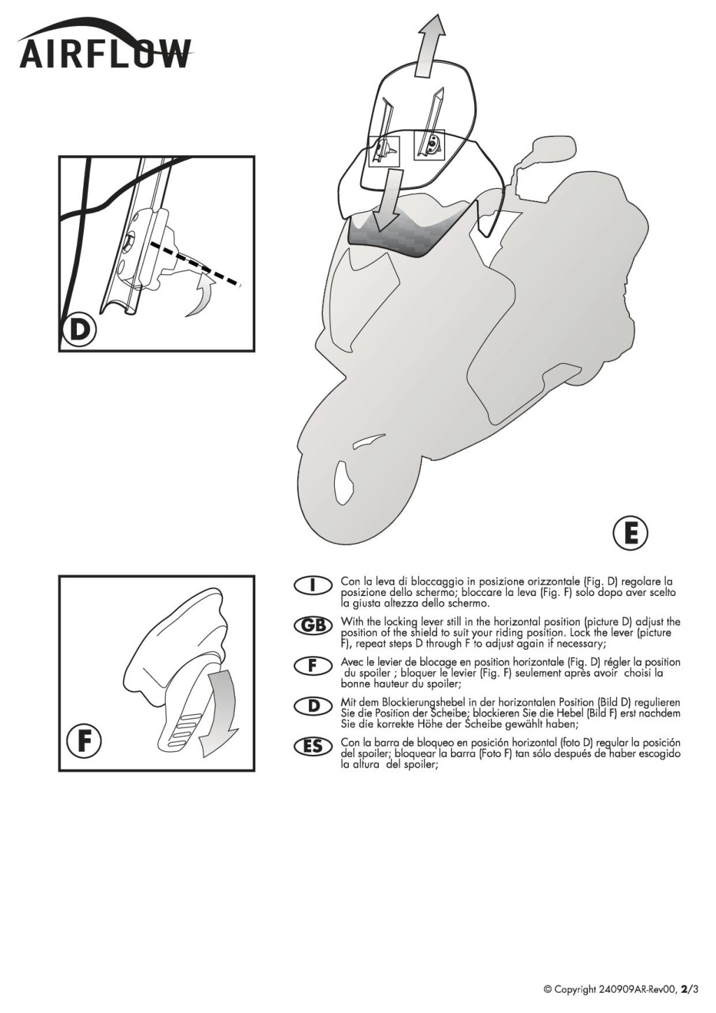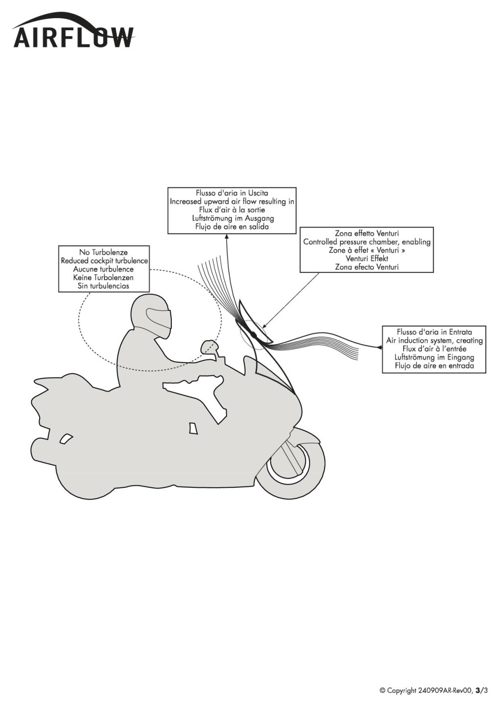 Aki esőben is használja a robogót vagy motort, az végre megoldhatja a szélvédőn megálló, idegesítő vízcseppek problémáját, amelyek az autó fényszóróitól megvilágítva szinte semmivé teszik a kilátást, veszélyes helyzeteket teremtve; az Airflow szélvédőt valóban le lehet engedni a közvetlenül a szem látószöge alá, hogy biztonságosan tovább lehessen vezetni.