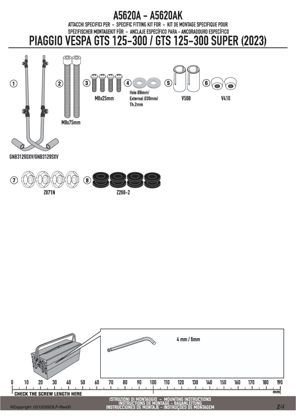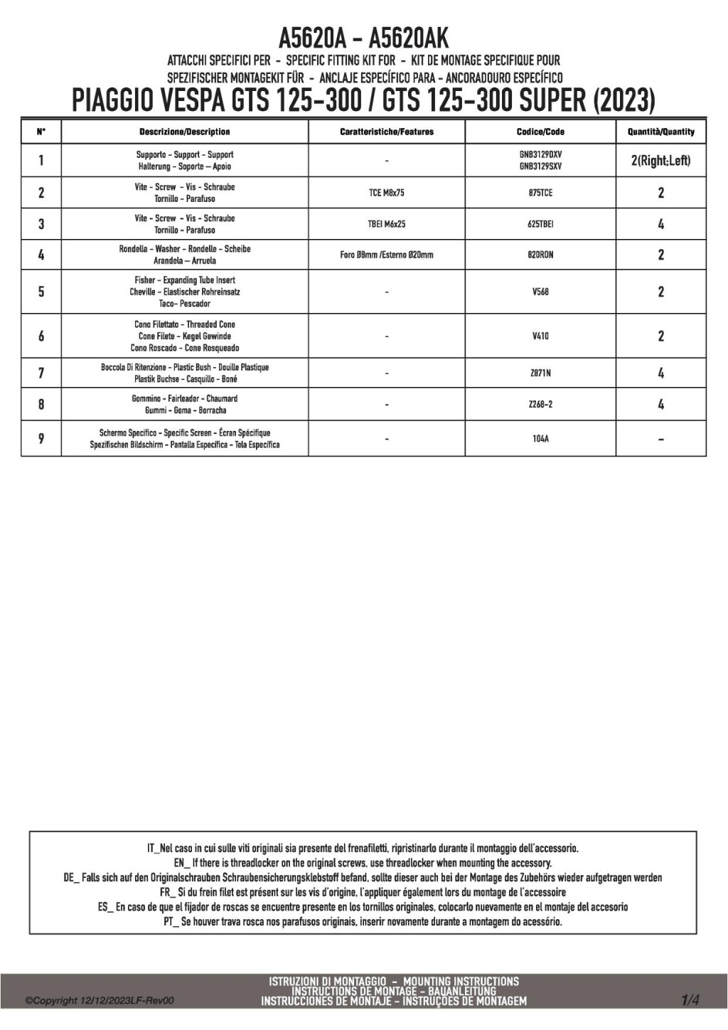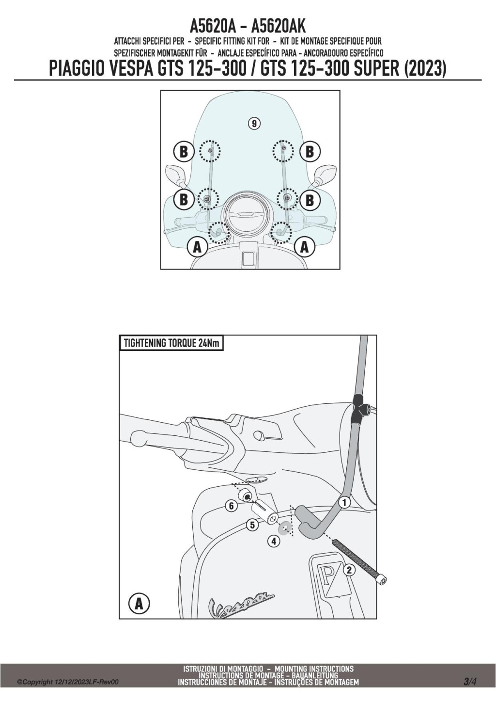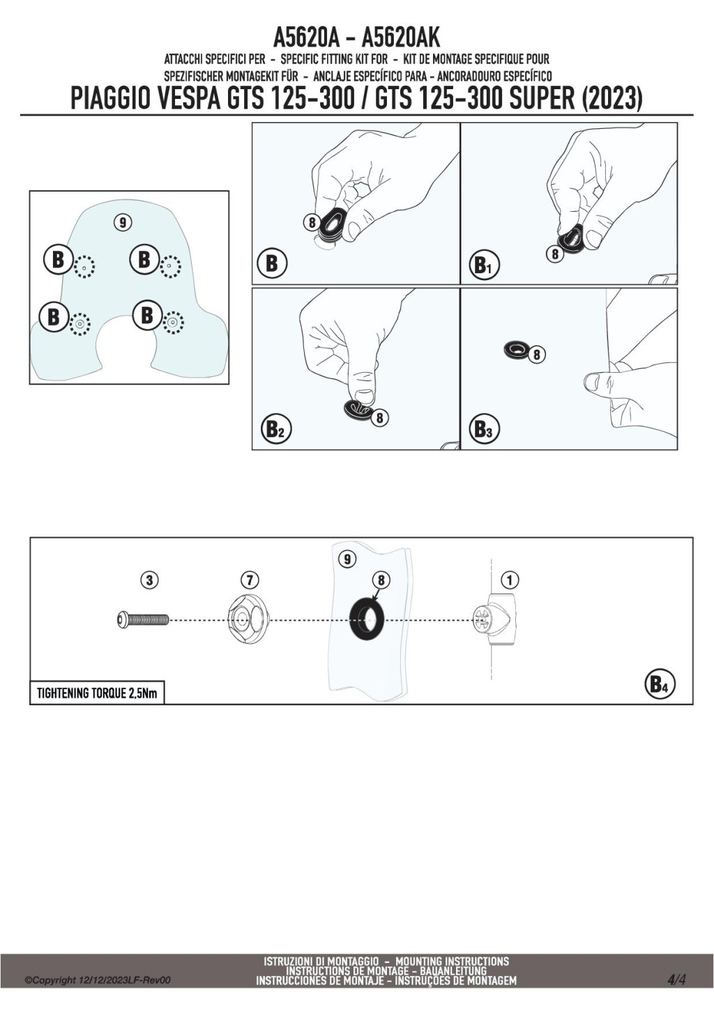 GIVI A5620A – Rögzítő készlet a 104A / 104S plexikhez PIAGGIO Vespa GTS 125-300 (2023-2025) /  Vespa GTS 310 (2025)
