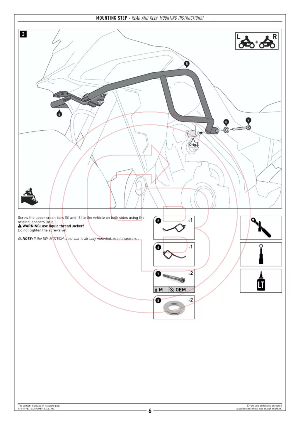 Az SW-Motech bukócső megbízható védelmet nyújt motorod számára, ha váratlan helyzet adódik. Robusztus, acélcsövekből készült, így hatékonyan óvja a blokkot és az érzékeny alkatrészeket esés vagy eldőlés esetén. A precízen tervezett kialakításnak köszönhetően tökéletesen illeszkedik a gyári felfogatási pontokhoz, így a szerelés egyszerű. A porfestett felület tartós, ellenáll az időjárásnak és a korróziónak, miközben sportosan elegáns megjelenést ad a motornak. Válaszd az SW-Motech bukócsövet, ha biztonságot, tartósságot és stílust szeretnél minden motoros kaland során.
