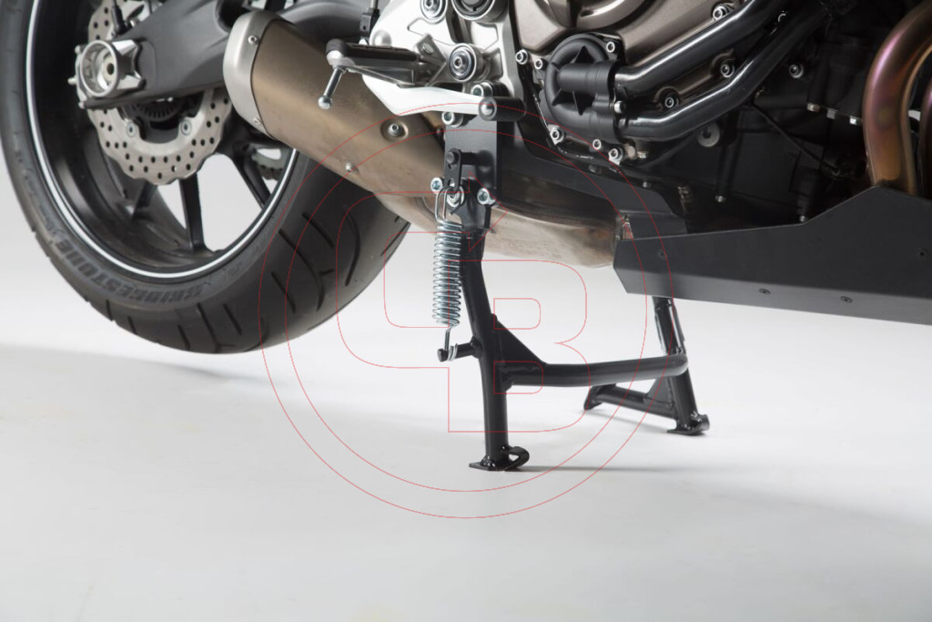 SW-MOTECH középsztender a , homokszórt, porfestett acélcső-konstrukció, amely nagy hasmagasságot és dőlésszöget biztosít. Stabil támaszt ad karbantartáskor és hosszabb leállás során, téli tárolásnál pedig tehermentesíti a gumikat.