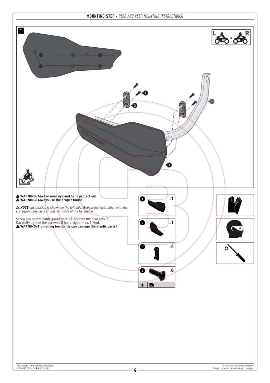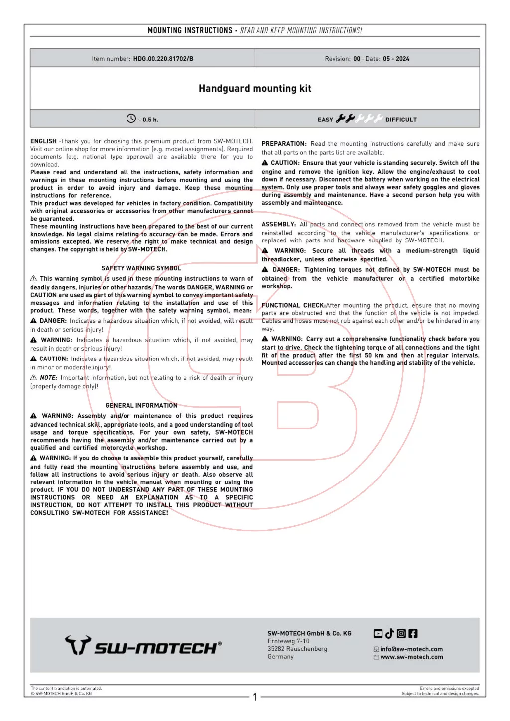 A tartókeret nem kompatibilis más SW-Motech kézvédőkkel (pl. KOBRA vagy BBSTORM).