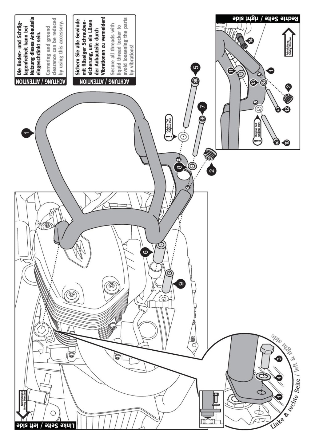 Stabil védelmet nyújt a hengerfejnek és oldalsó elemeknek, miközben megtartja a kanyarodási maximum dőlésszöget. A szett bal és jobb oldali bukócsövet, rögzítőanyagot és útmutatót tartalmaz.