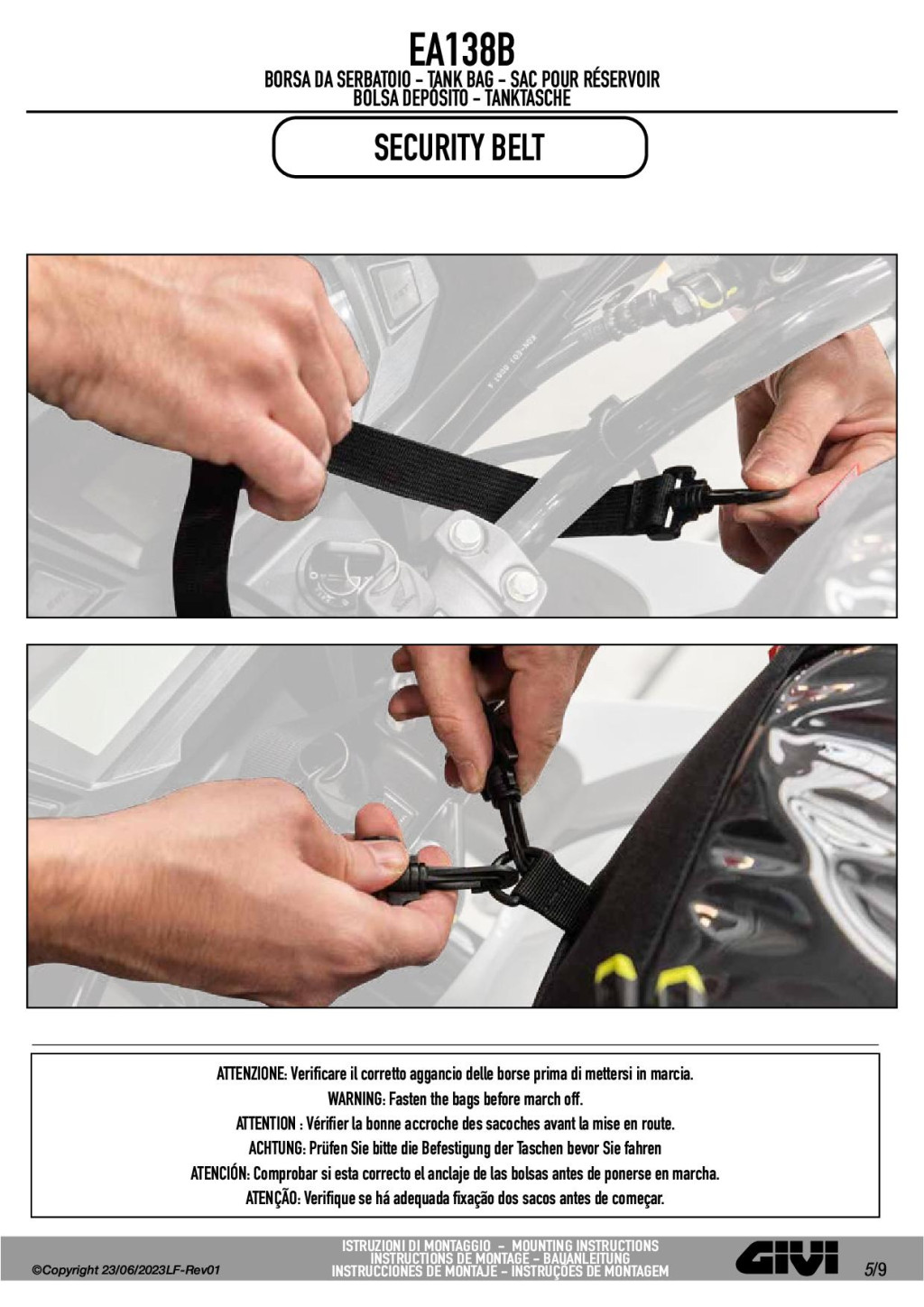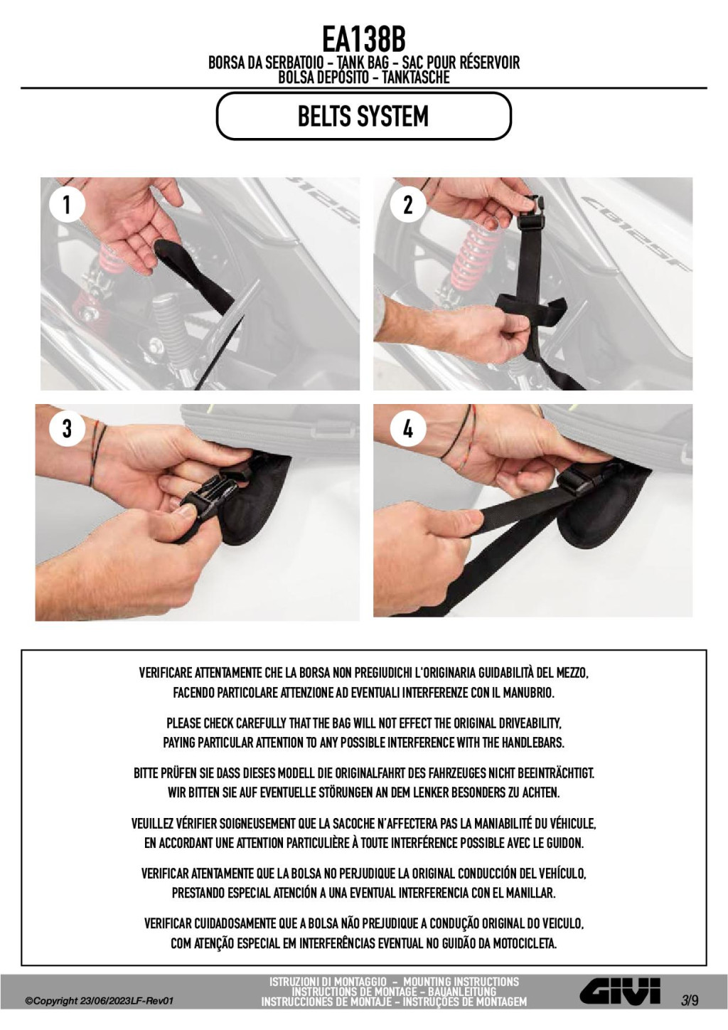 • A T460B egy univerzális rögzítőalap műanyag tankokhoz, PVC csúszásgátló bevonattal, 4 állítható hevederrel. Egyszerűen rögzíthető és a legtöbb motorhoz illeszkedik, lehetővé téve a táska gyors fel- és levételét.