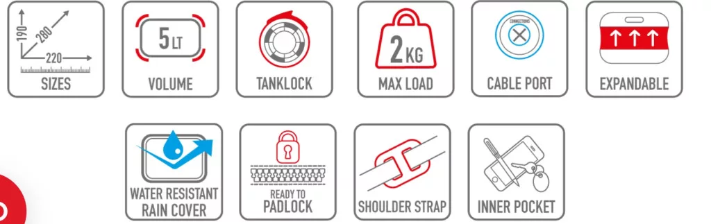 Az oldalsó zsebek kompatibilisek a GIVI Power Hub rendszerrel, így egyszerűen töltheted eszközeidet útközben. A fedél belső oldalán külön rekesz található, valamint neoprén telefontartó gondoskodik a készüléked biztonságáról és könnyű hozzáférhetőségéről. A cipzár kialakítása lehetővé teszi egy biztonsági lakat használatát, így értékeid még nagyobb védelemben részesülnek. A csomag része egy vízálló esővédő huzat, valamint kényelmes vállpánt a motoron kívüli hordozáshoz.