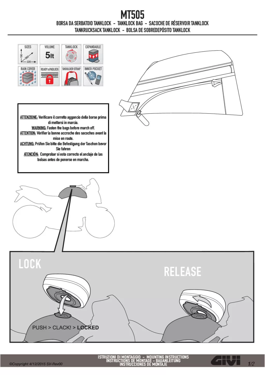 A Tanklock rendszernek köszönhetően a táska egyetlen mozdulattal felhelyezhető vagy levehető, miközben stabilan a helyén marad menet közben. Vásárlói visszajelzések alapján a GIVI MT505 különösen praktikus a kompakt mérete, a gyors hozzáférés és a stílusos megjelenés miatt, amely tökéletesen illeszkedik a modern motorkerékpárokhoz.