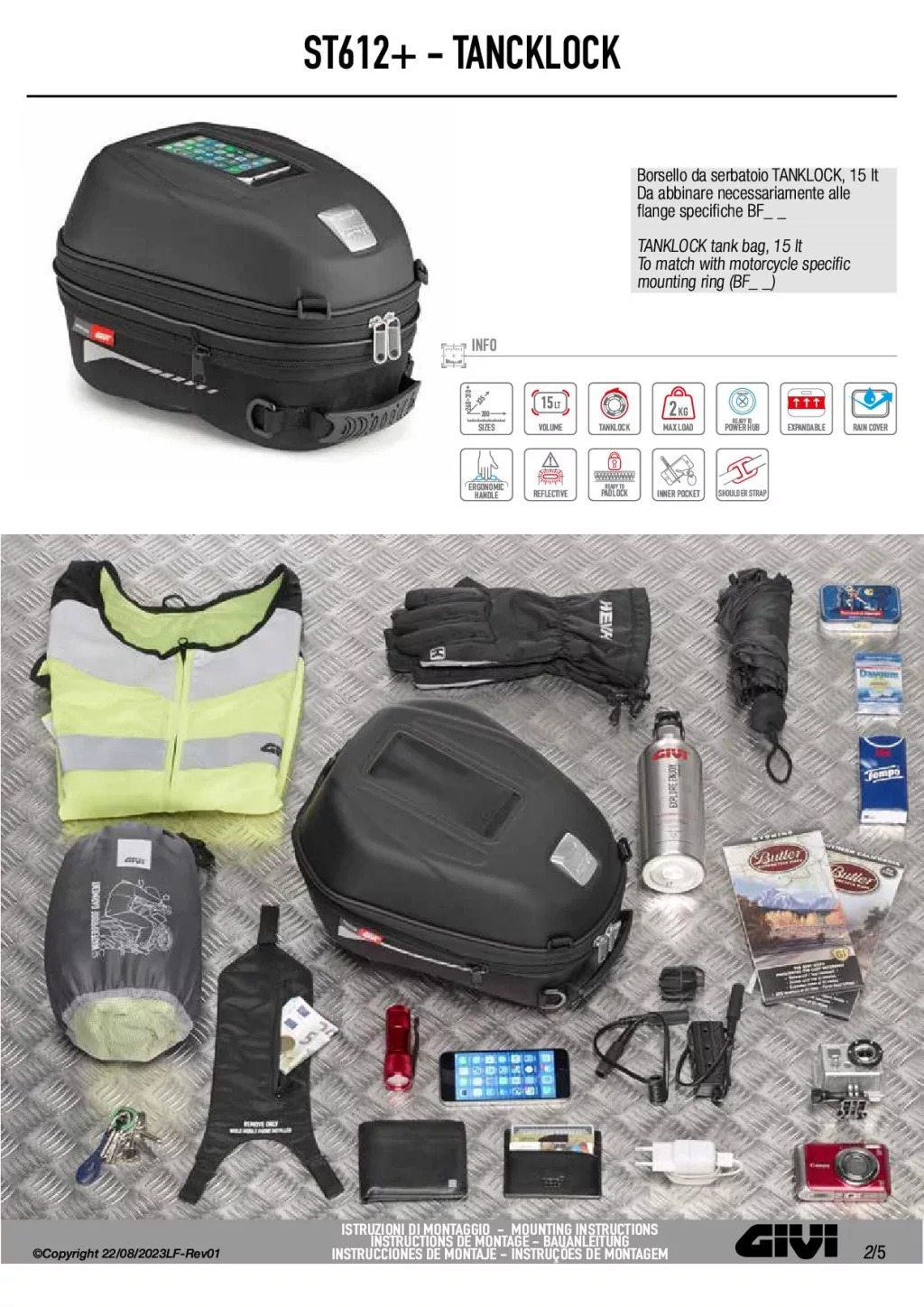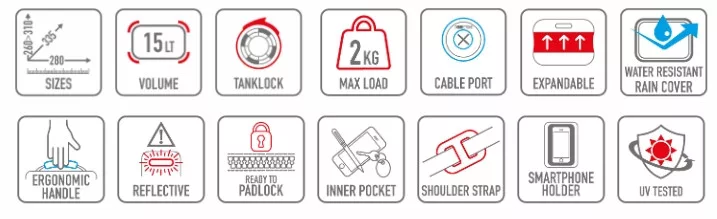 A táska tervezésekor a motorosok kényelme és biztonsága volt a fő szempont. Reflektív elemek gondoskodnak a jobb láthatóságról, míg a vízálló esővédő huzat megóvja a tartalmat a nedvességtől. Belül található okostelefon-tartó ablak kábelfeed nyílással, belső szemüvegtartó, valamint rendezett tárolást biztosító zsebek. A hordozhatóság érdekében kényelmes kézifogantyúval és állítható vállpánttal is felszerelték. A TANKLOCK rendszer gyors és stabil rögzítést biztosít, motortípus-függő BF adapter segítségével.