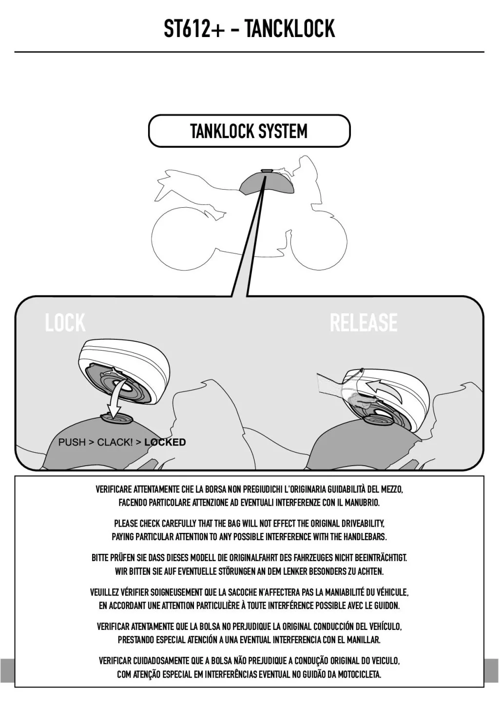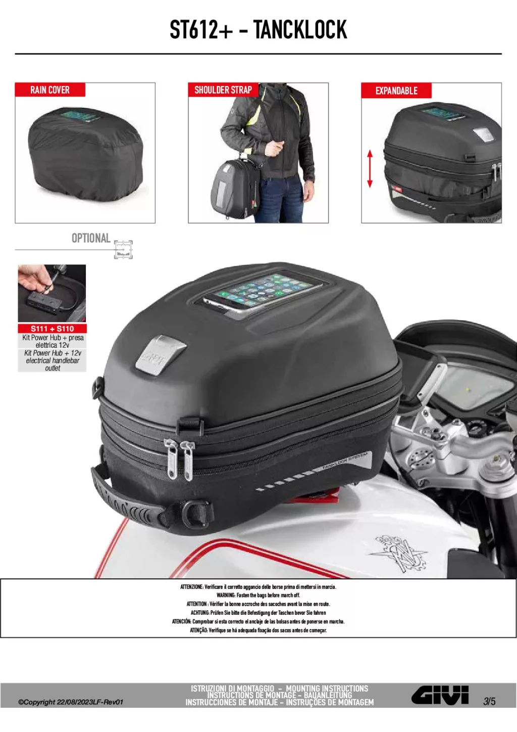 A GIVI ST612 egy prémium kategóriás, thermoformázott, TANKLOCK rendszerű motoros tanktáska, amely alaphelyzetben 12 literes, de a praktikus bővítési funkcióval akár 15 literes kapacitásra is növelhető. Erős, REACH előírásoknak megfelelő 1200D/PVC poliészterből, valamint karcálló PU bevonatú EVA anyagból készült, így hosszú élettartamot és magas szintű kopásállóságot biztosít. Az UV-sugárzással szembeni nagy ellenállásának köszönhetően a táska hosszú időn át megőrzi elegáns megjelenését.