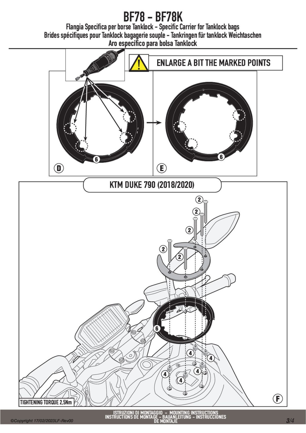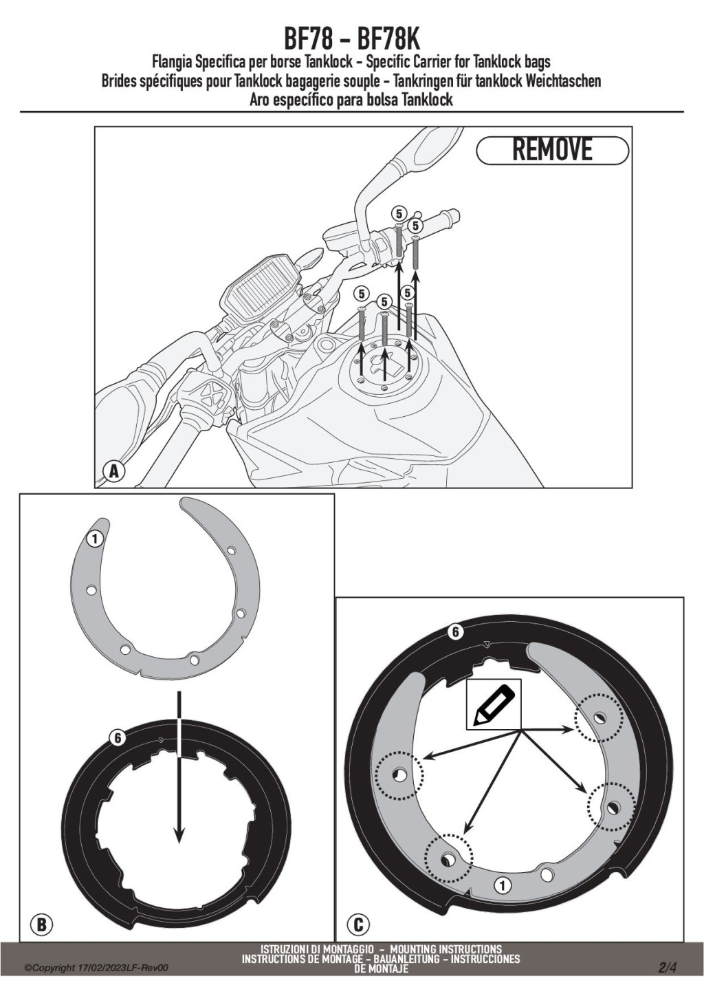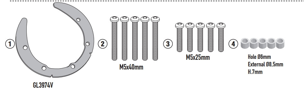 Ebben a csomagban található alkarészeket és a tanktáska részeként vásárolt műanyag gyűrűt kell felszerelni a motor üzemanyag tartályára. Az így kialakíott tartóra lehet feltenni a táskát.