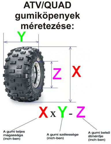 • Méret: Például 25x8-12 – az első szám (25) az átmérőt incsben, a második szám (8) a szélességet, a harmadik szám (12) pedig a felni átmérőjét jelöli.