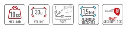 A doboz 33 literes kapacitása felszerelések, ruhák és túrafelszerelések szállítására ideális. Maximális terhelhetősége 10 kg, külső mérete 393 × 266 × 557 mm.