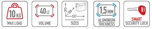 A doboz 40 literes kapacitása felszerelések, ruhák és túrafelszerelések szállítására ideális. Maximális terhelhetősége 10 kg, külső mérete 393 × 306 × 557 mm.