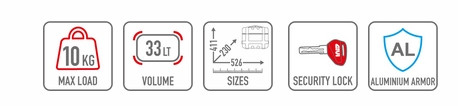 Méretei: 411 x 230 x 526 mm. Kapacitása 33 liter, maximális terhelhetősége 10 kg. Ez a méret ideális kisebb felszerelések, kabátok vagy akár egy nyitott sisak tárolására.
